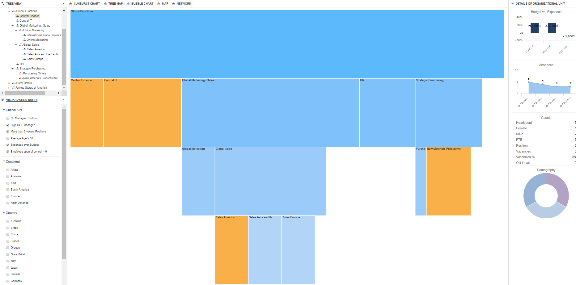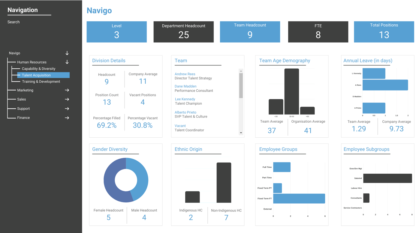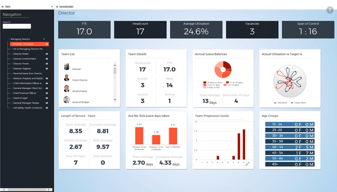 Powerful tools that quickly drill down through organisational data, instantly displaying important KPIs. Visualisation rules can be customised by the user, allowing you to highlight areas of focus. Please select the chart name below to view an example.