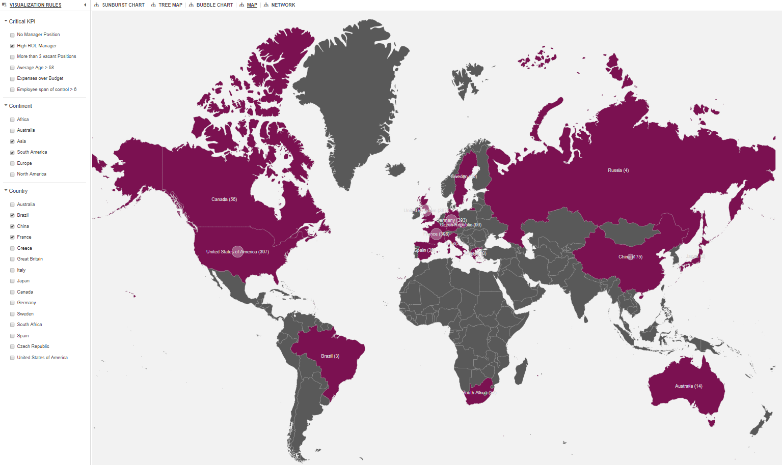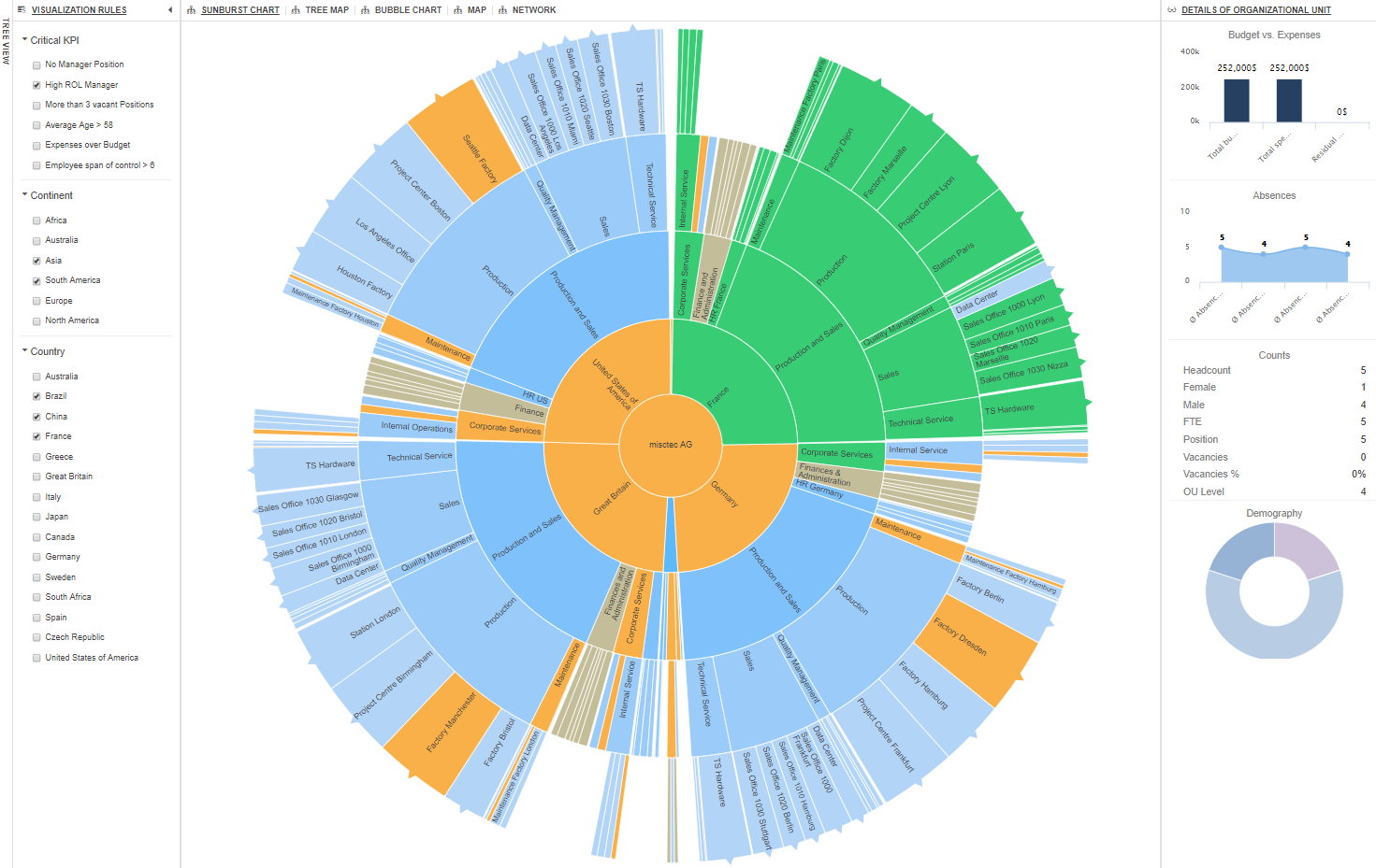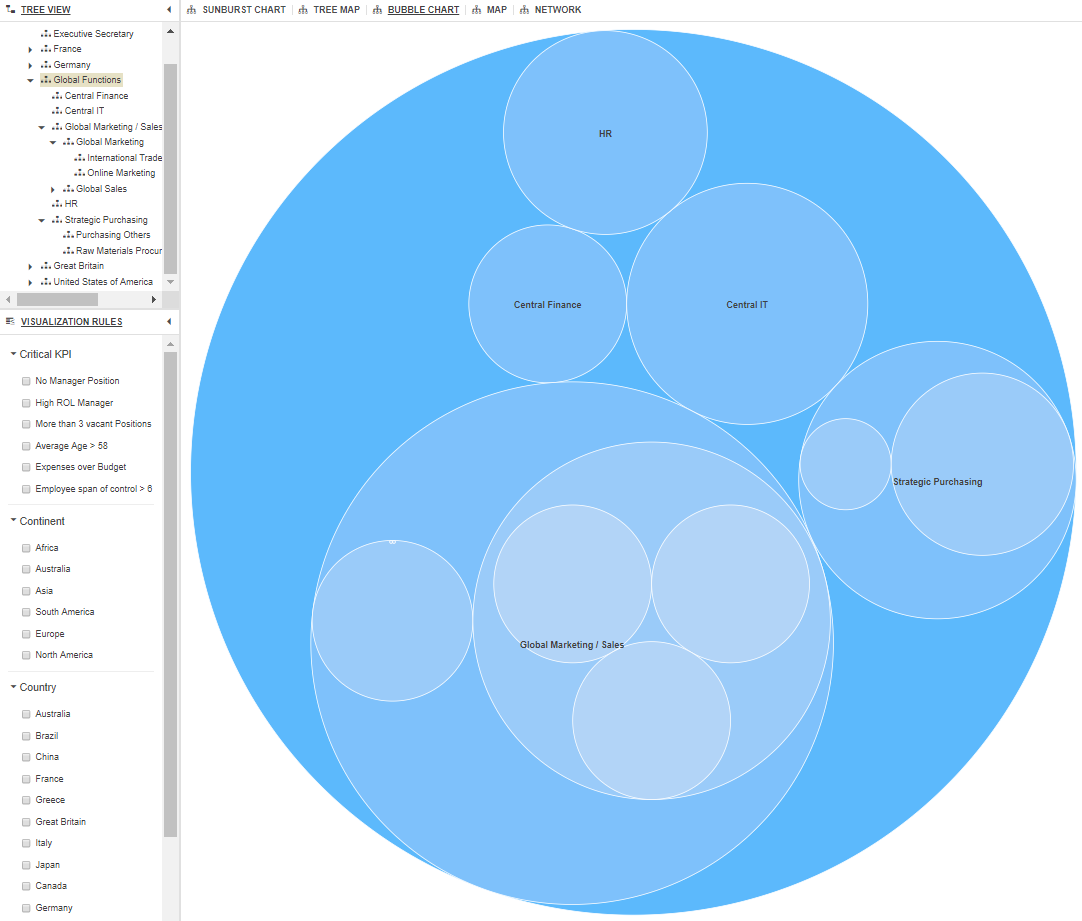 Powerful tools that quickly drill down through organisational data, instantly displaying important KPIs. Visualisation rules can be customised by the user, allowing you to highlight areas of focus. Please select the chart name below to view an example.